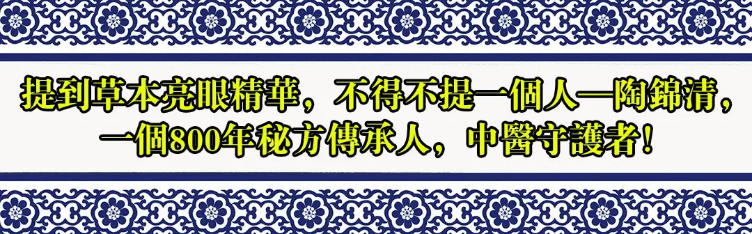 不管你是哪種眼病,病史多長、多重,只要服用陶教授研製的“中藥草本亮眼精華”都可以立竿見影!都能看得清看得遠……不要再用傳統方法,再開刀來治眼病了,不要再做其它不必要的治療了,以前花了多少冤枉錢也沒治好,各種眼病的根源都是眼道堵塞,眼毒滋生,用陶教授研製的“中藥草本亮眼精華”一定能打通眼道,拔除眼毒換雙新眼。”